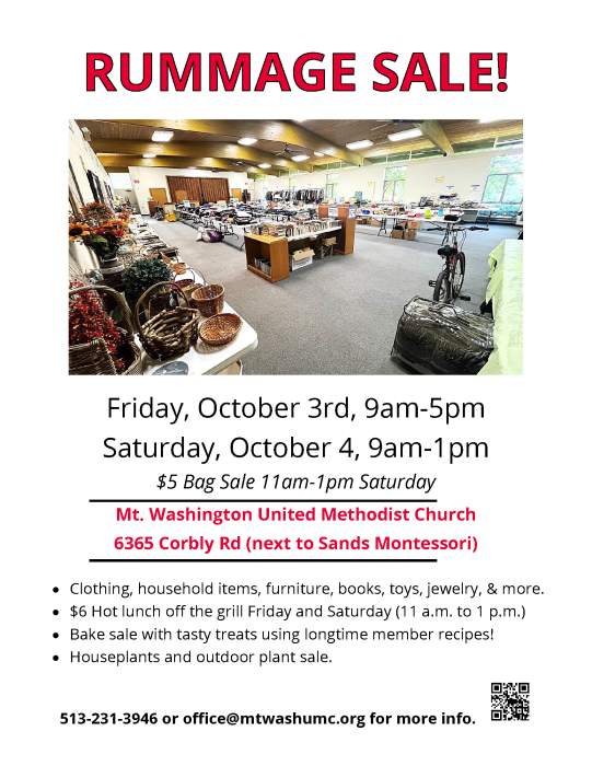 Mt Washington United Methodist Church will be holding their annual rummage sale October 3-4, 2025. Located at 6365 Corbly Rd, Cincinnati, this popular fundraiser has home goods, clothes, books, kids toys, Christmas decorations, shoes, purses, furniture, jewelry, electronics, art and more - and it's all super cheap!
