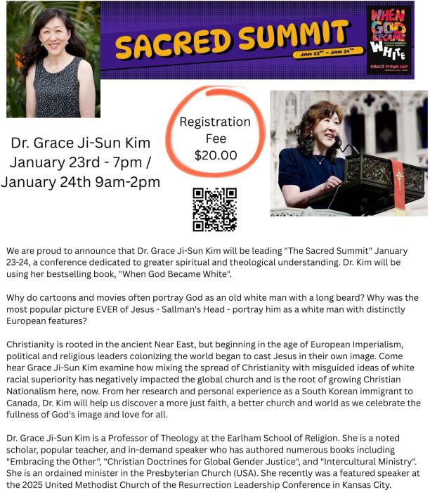 You're invited to Westwood United Methodist Church in Cincinnati the weekend of January 23-24 for The Sacred Summit led by Dr. Grace Ji-Sun Kim. She is the author of the bestselling book, "When God Became White." During the Summit, Dr. Kim will help us discover a more just faith, a better church and world as we celebrate the fullness of God's image and love for all.