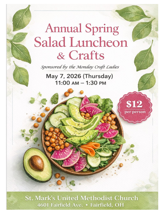 St. Mark's United Methodist Church in Fairfield once again invites you to their annual Salad Luncheon, Crafts & Book Sale taking place on Thursday, May 7, 2026 from 11am-1:30pm.