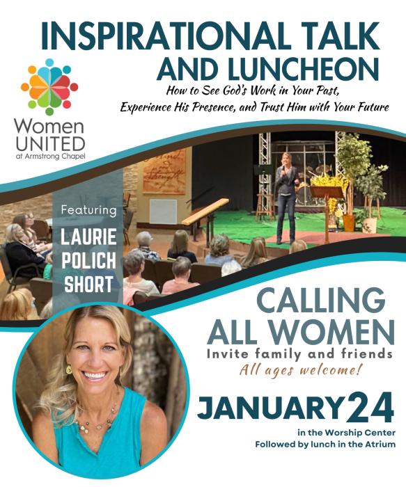The United Women of Faith at Armstrong Chapel UMC want to invite all women to a winter retreat featuring author and speaker, Laurie Polich Short, on January 24, 2026 from 10:30am-1pm. She will be sharing insights from her newest book, Tracking God in Your Life.